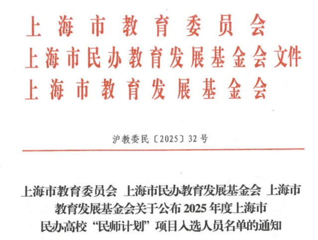 根据上海市教育委员会、上海市民办教育发展基金会、上海市教育发展基金会联合发布《关于公布2025年度上海市民办高校“民师计划”项目入选名单的通知》(沪教委民〔2025〕32号),我校韩丽莹等10名教师成功入选,入选数量创历年新高,充分彰显了我校在教育教学改革领域的创新活力与综合实力。